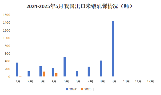 未锻轧锑出口方面,2025年5月中国未锻轧锑出口量为0吨,环比下降100%,同比下降100%;1-5月未锻轧锑出口量为247.0吨,同比下降84.0%。