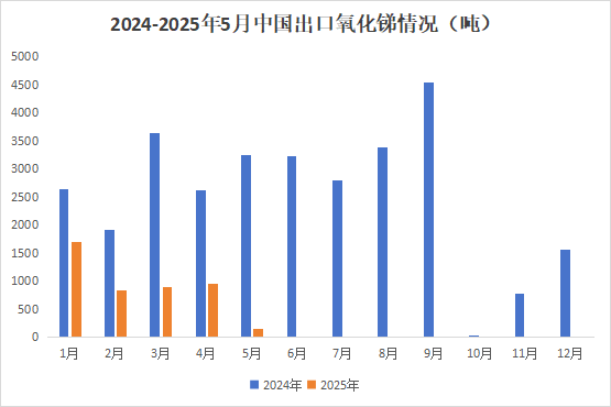 据海关统计数据显示,2025年5月中国氧化锑出口量为159.0吨,环比下降83.4%,同比下降95.1%;1-5月氧化锑出口量为4563.6吨,同比下降67.7%。
