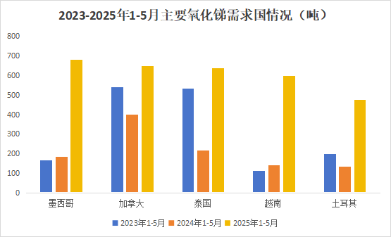 分国别来看,1-5月中国出口氧化锑主要销往墨西哥、加拿大、泰国、越南、土耳其等国家和地区,分别为墨西哥681.5吨,同比上升268.4%;加拿大648.0吨,同比上升62.0%;泰国637.5吨,同比上升195.1%;越南599.6吨,同比上升320.1%;土耳其478.0吨,同比上升250.7%。