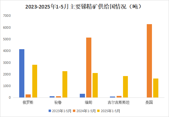 分国别来看,1-5月中国进口的锑矿砂及精矿主要来自俄罗斯、秘鲁、缅甸、吉尔吉斯斯坦、泰国等国家和地区,分别为俄罗斯2827.3吨,同比上涨918.6%;秘鲁2268.8吨,同比上涨1565.7%;缅甸2113.1吨,同比下降59.0%;吉尔吉斯斯坦1865.0吨,同比上升1179.7%;泰国1640.1吨,同比下降73.9%。