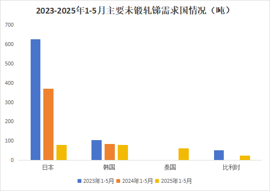分国别来看,2025年1-5月中国出口未锻轧锑销往日本80.0吨,同比下降78.4%;韩国80.0吨,同比下降6.0%;泰国62吨,去年同期没有出口泰国未锻轧锑;比利时25吨,去年同期没有出口比利时未锻轧锑。