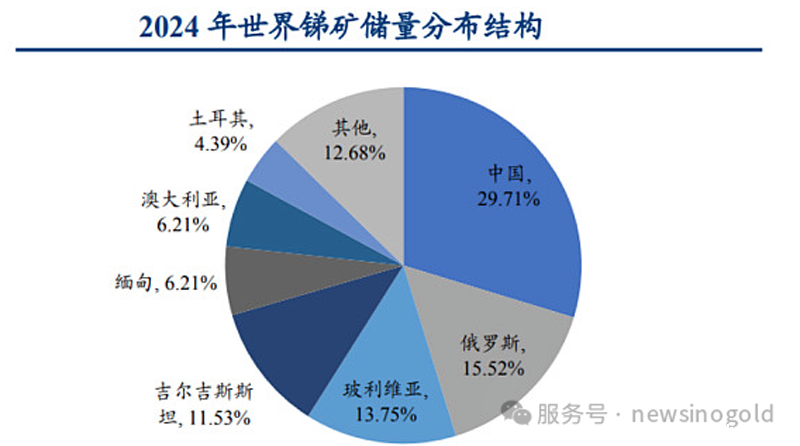 全球锑资源主要分布于环太平洋成矿带、中亚成矿带和地中海成矿带,具有分带性与集中性特点。按锑矿储量排名依次为中国、俄罗斯、玻利维亚、吉尔吉斯斯坦、澳大利亚、土耳其、加拿大、美国、塔吉克斯坦、巴基斯坦、墨西哥,分别占比25.64%、18.70%、16.56%、13.89%、7.48%、5.34%、4.17%、3.21%、2.67%、1.39%、0.96%。